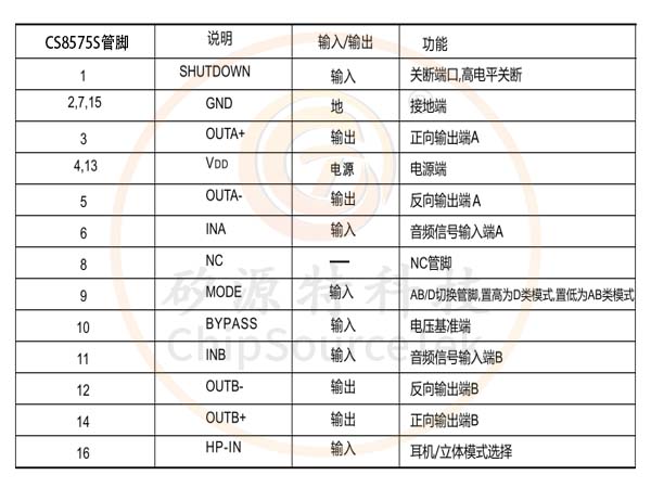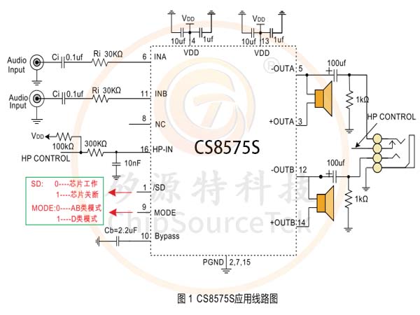 The CS8575S adopts a dual channel design, which enables the chip to have two working modes: bridge connected speaker amplification and single terminal stereo headphone amplification.