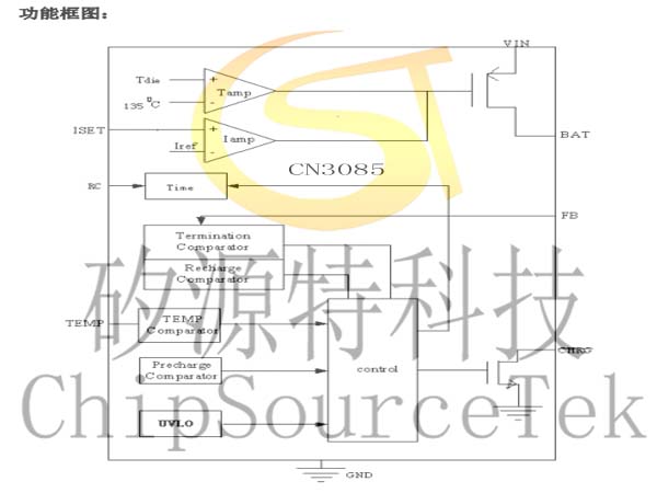 4 | VIN | Input voltage positive input end.The voltage of this pin is the working power supply of the internal circuit. When the voltage difference between VIN and BAT pin is less than 10mv, the CN3085 will enter the low-power sleep mode, and the current of BAT pin is less than 3uA. |