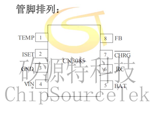 7 | CHRG | Charge status indicator for the open drain output.When CN3085 is in trickle charging state, constant current charging state and maintain charging state, CHRG pin is pulled to low level by internal switch, indicating that charging is in progress; Otherwise, the CHRG pin is in a high resistance state. |