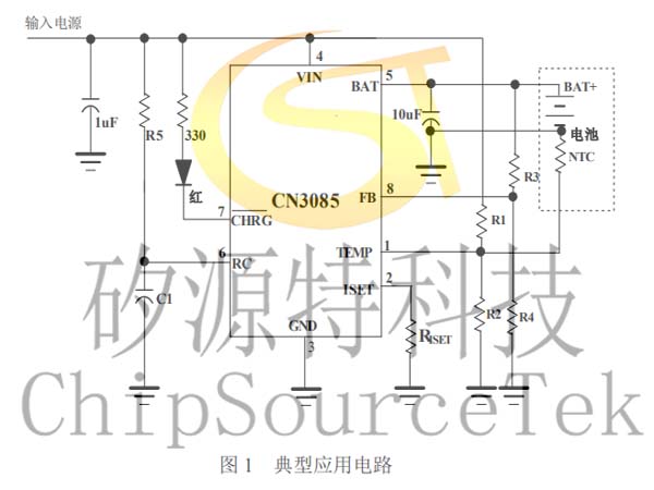 6 | RC | Maintain charge timing Settings.In the constant current charging state, when the battery voltage reaches the constant current charging termination voltage, the constant current charging state ends, CN3085 enters the maintenance charging state, and charges the battery with the maintenance current, which is 60% of the set constant current charging current, and starts the maintenance charging timer at the same time. When the maintenance charging time ends, the whole charging process ends, and the charger enters the charging end state. The maintenance charge time is determined by the following formula: T = 2654 x R5 x C1+4980 x C1 x 103 Where, T is the timing time (unit: second). R5 unit is ohms, should be in 20k to 5M ohms, otherwise the timing accuracy may be affected C1 unit is farad, should be greater than 1nF, otherwise the timing accuracy may be affected. |