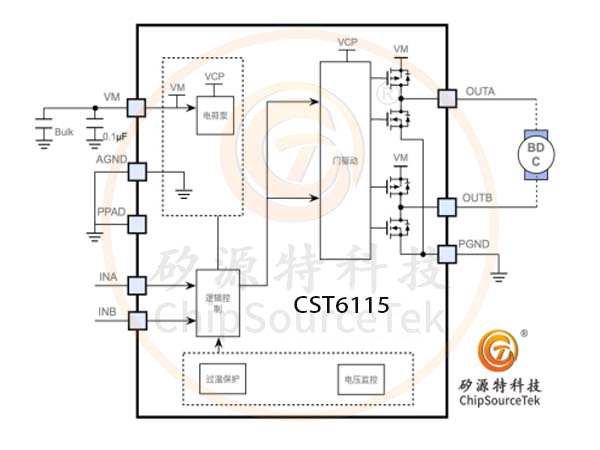 The CST6115 integrates the four functions of forward rotation, reverse rotation, stop and braking of brushed motors. It can also drive one winding of a stepper motor and alternately drive with another CST6115 to achieve the stepper function.