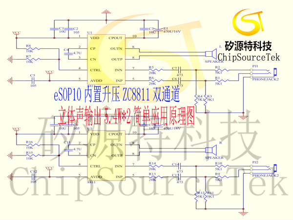 eSOP10内置升压ZC8811双通道立体声输出5.4W*2简单单应用原理图