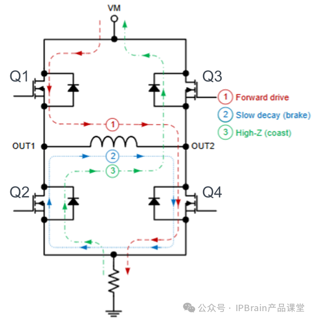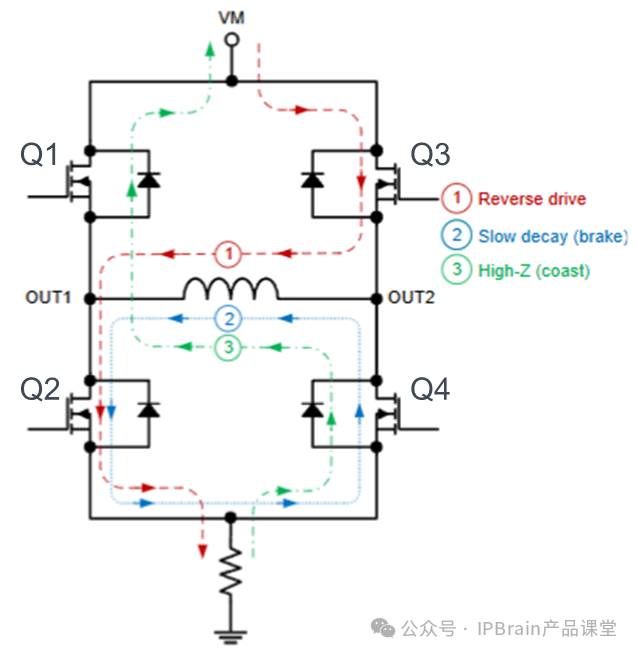 反转:Q2和Q3导通时,电流依次经过Q3、M、Q2,电机反转;