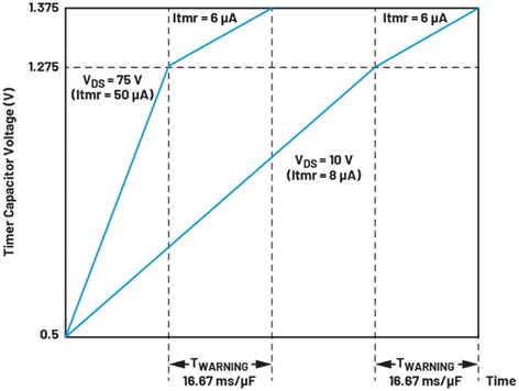 图3.在LT4363中,根据漏源电压对定时电容器进行充电,实现对SOA曲线的一种准仿真。