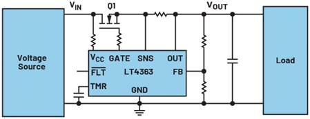 例如,在配电系统中,高负载的快速断开可能会导致过压的产生。为保护连接到同一电源的其他负载,建议采取浪涌保护措施。图1所示为一个保护电路的布局,在待保护的电子电路前端使用了LT4363。此示例源自一个额定电源电压为24 V的工业应用。