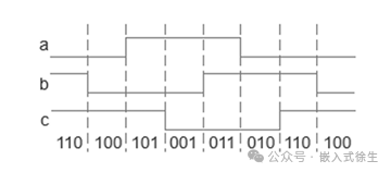 在无刷电机中一般把3个霍尔传感器间隔120°的圆周分布安装如图所示。输出信号高低电平各占180°角。设输出的高电平为1,低电平用0表示,则输出三个信号用二进制编码表示如上表。