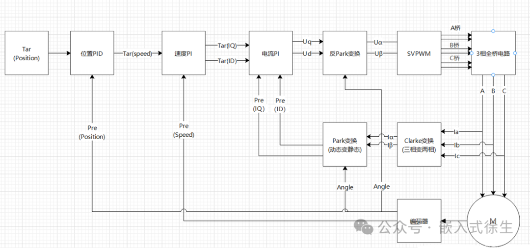 FOC控制无刷电机过程,通过对无刷电机的三相电流采样进行Clarke变换,将三相正弦电流信号转换为两相正弦信号,再经Park变换(旋转变换),转换为两个直流信号作为电流闭环的输入,再经反Park变换和空间矢量脉宽调制控制三相全桥的开断,从而实现无刷电机的控制。