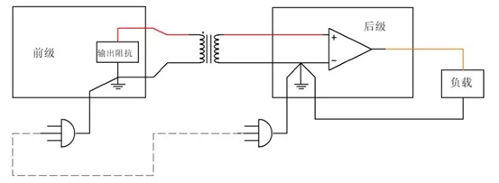 As shown in the above picture, the red line is the power supply line and the black line is the ground line. The audio of Device 1 and Device 2 are interconnected, and the shielded wire is connected to the ground for the first time. Device 2 also needs to supply power to Device 1, and the power ground wire is also connected, resulting in the black GND loop shown in the above picture.